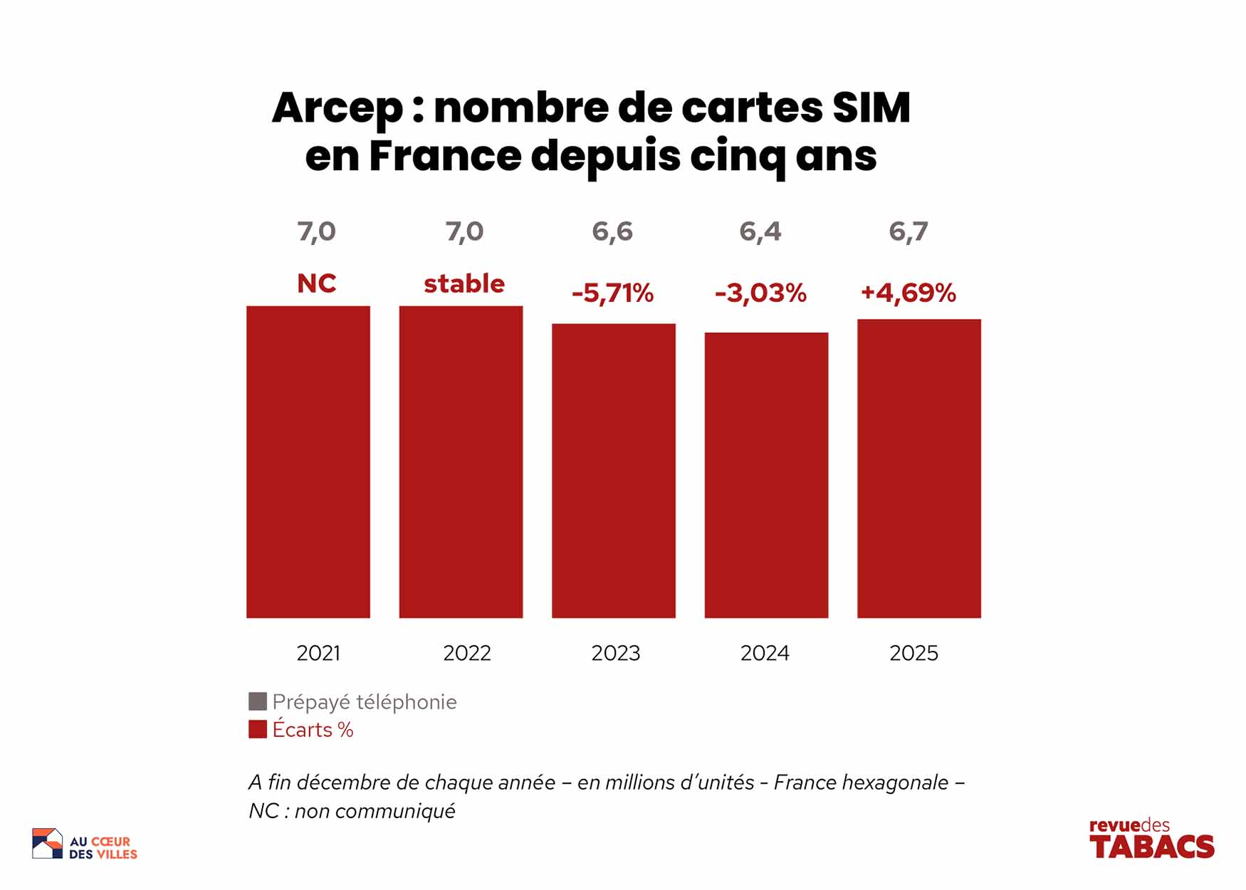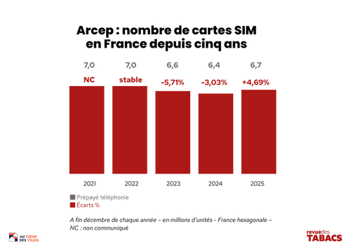 5 février 2026. L’autorité de régulation des communications électroniques, des postes et de la distribution de la presse a publié son rapport sur la téléphonie mobile du quatrième trimestre 2025. L’Arcep mentionne dans cet observatoire des marchés mobiles en France que le segment des cartes prépayées (qui sont en partie commercialisées dans les débits de tabac) est en hausse de +4,69% par rapport aux trois derniers mois 2024, à 6,7 millions de cartes prépayées.
