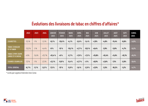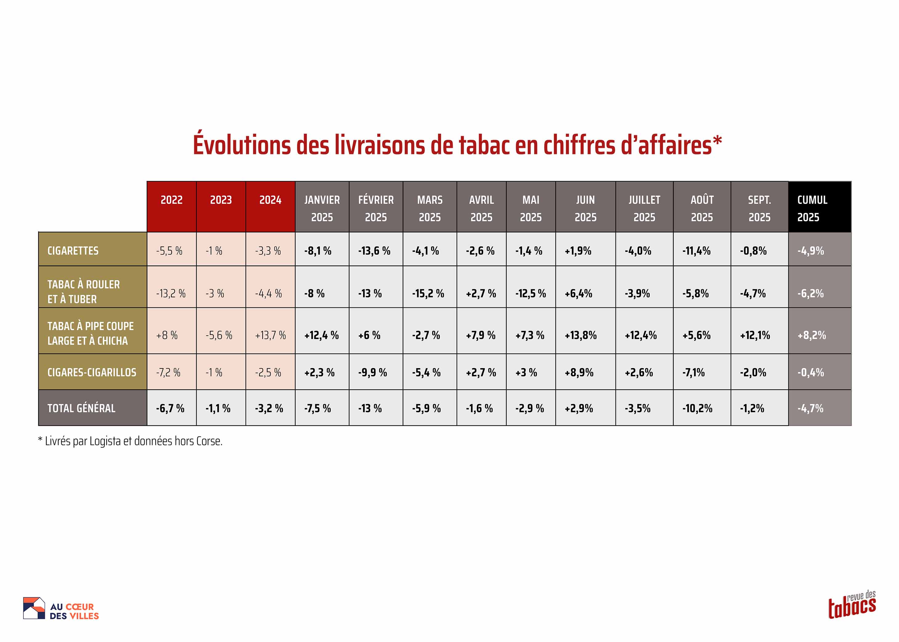 8 octobre 2025. Le principal logisticien du tabac en France, Logista, a confirmé que le chiffre d’affaires général tabac a chuté de -1,2% en septembre 2025, après les -10,2% en août, -3,5% en juillet 2025, +2,9% en juin, -2,9% en mai, -1,6% en avril, -5,9% en mars, -13% en février et les -7,5% en janvier 2025. Toujours sur le total des segments tabac, ces neuf premiers mois de l’année sont à -4,7% en valeur, après un cumul 2024 à -3,2%. Malgré un jour de livraison en plus en septembre 2025 (22) comparé au neuvième mois 2024 (21), trois des principaux segments en valeur baissent : -0,8% en cigarettes, -4,7% en tabac à rouler et à tuber et -2% en cigares-cigarillos. À l’opposé, on constate +12,1% en tabac coupe large, à pipe et à chicha.