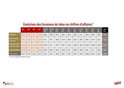 10 novembre 2025. Le principal logisticien du tabac en France, Logista, a confirmé que le chiffre d’affaires général tabac a chuté de -7% en octobre 2025, après les -1,2% en septembre, -10,2% en août, -3,5% en juillet 2025, +2,9% en juin, -2,9% en mai, -1,6% en avril, -5,9% en mars, -13% en février et les -7,5% en janvier 2025. Toujours sur le total des segments tabac, ces dix premiers mois de l’année sont à -4,9% en valeur, après un cumul 2024 à -3,2%. Avec le même nombre de jours de livraison en octobre 2025 (23) comparé au dixième mois 2024 (23), trois des principaux segments en valeur baissent : -8,4% en cigarettes, -1,3% en tabac à rouler et à tuber et -5,5% en cigares-cigarillos. À l’opposé, on constate +8,3% en tabac coupe large, à pipe et à chicha.