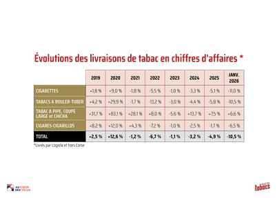 9 février 2026. Le principal logisticien du tabac en France, Logista, a confirmé que le chiffre d’affaires général tabac chute drastiquement avec -10,5% en janvier 2026, après les -1,1% en décembre 2025. Avec un jour de livraison en moins en janvier 2026 (21) comparé au premier mois 2025 (22 jours), trois des principaux segments en valeur baissent : -11% en cigarettes, -10,5% en tabac à rouler et à tuber, -6,5% en cigares-cigarillos. En revanche, on constate +6,6% en tabac coupe large, à pipe et à chicha.