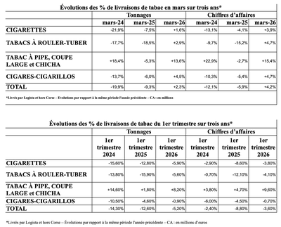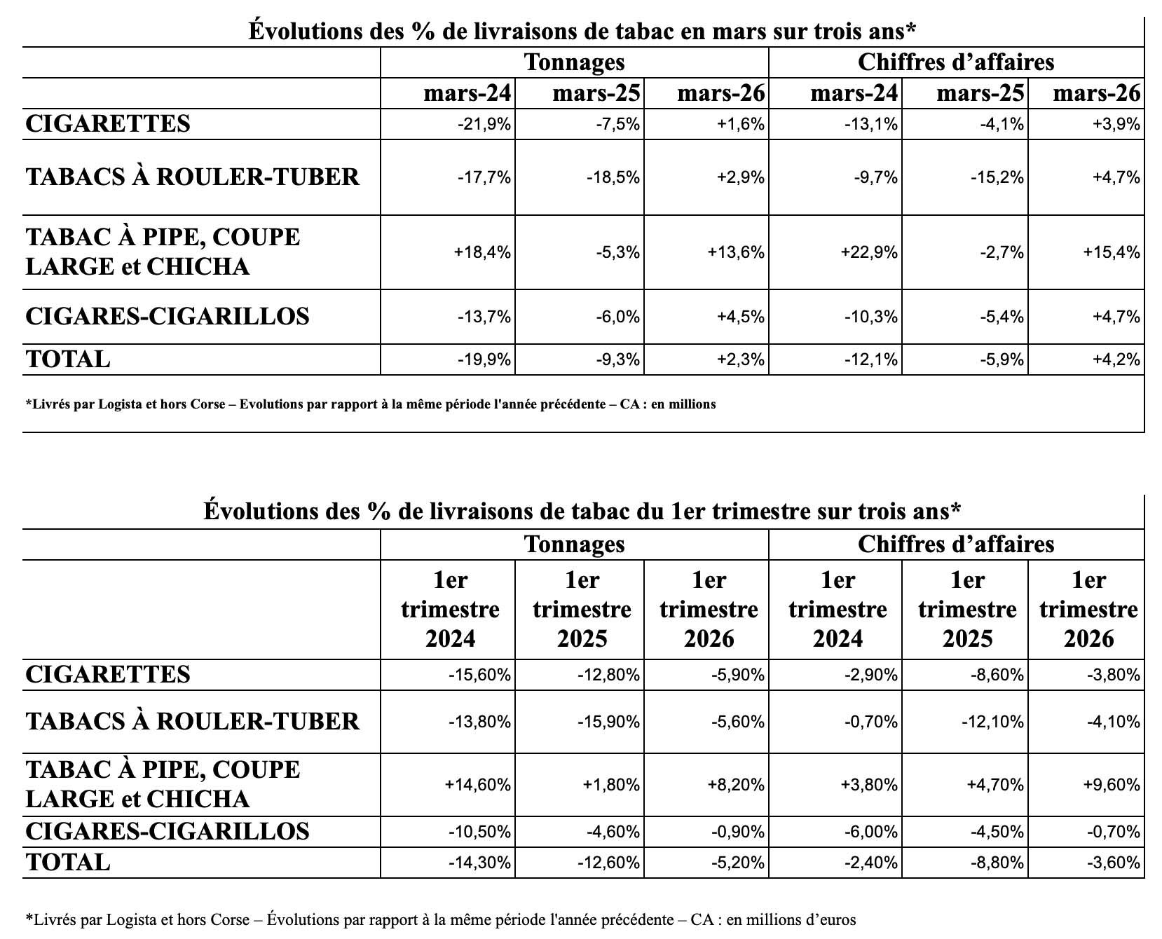9 avril 2026. Le principal logisticien du tabac en France, Logista, a annoncé que le chiffre d’affaires général tabac a progressé avec +4,2% en mars 2026, après les -4,1% en février 2026, -10,5% en janvier et les -1,1% en décembre 2025. Avec un jour de livraison supplémentaire en mars 2026 (22) comparé au troisième mois 2025 (21 jours), les principaux segments en valeur augmentent : +3,9% en cigarettes, +4,7% en tabac à rouler et à tuber, +15,4% en tabac coupe large, à pipe et à chicha +4,7% en cigares-cigarillos.