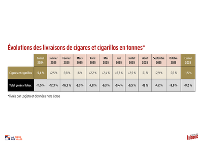 10 novembre 2025. Le principal logisticien du tabac en France, Logista, a confirmé que le volume des livraisons de cigares-cigarillos a chuté de -7,6% en octobre 2025 (avec 23 jours d’activité contre le même nombre, soit 23, sur le dixième mois 2024), après les -2,9% en septembre, -7,1% en août, +2,5% en juillet, +8,7% en juin, +2,4% de mai, +2,2% d’avril, -6% de mars, -3,9% de février et +2,5% de janvier 2025. Ces volumes mensuels donnent -1,5% sur les dix premiers mois 2025, après un cumul en 2024 à -5,4%, -6,2% de 2023, -9,3% en 2022, -4,1% en 2021 et -3,1% en 2020.