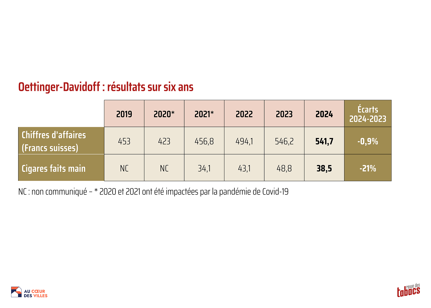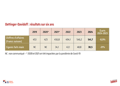 19 juin 2025. Le groupe cigarier suisse Oettinger-Davidoff a publié un communiqué au sujet de ses résultats 2024. Le chiffre d’affaires total de l’entreprise a baissé légèrement de -0,9%, à 541,7 millions de francs suisses, et la quantité de cigares roulés main produite a chuté de -21%, à 38,5 millions d’unités, après les +13,3% de 2023, à 48,8 millions de pièces (après les +26,3% de 2022 et les +35% en 2021). Plus précisément, le volume des marques premium du groupe augmente fortement, surtout pour Zino à +28,1% en 2024 (après les +32,2% en 2023 et +84% en 2022), mais concernant la marque Davidoff, aucun chiffre n’a été avancé pour 2024, à part les +15% sur le segment accessoires (après toujours en fait-main les +32,3% en 2023 et +28% en 2022).