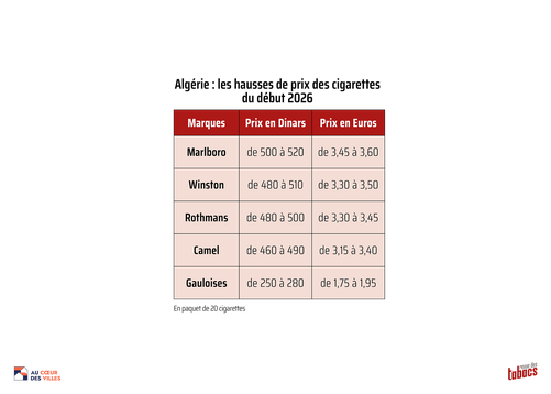 Début 2026. Le gouvernement algérien semble suivre le même chemin que la France en termes de lutte contre le tabagisme, avec une succession de hausses de prix sur les cigarettes. Mais les tarifs pour un paquet de 20 restent environ quatre fois moins chers en Algérie qu’en France en ce début 2026. Là-aussi, l’État est soupçonné d’augmenter les prix afin d’accroître ses rentrées fiscales tabac (comme il l’a fait pour les carburants), qui sont passées en 2022 de 92,7 milliards de dinars à environ 100 milliards de dinars en 2023.