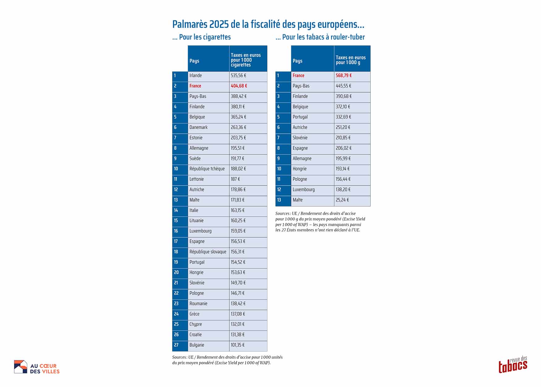 Début mars 2026. Hors Irlande du fait de son insularité, la France est le pays le plus taxé d’Europe continentale en cigarette et tabacs à rouler-tuber. Les niveaux de taxes spécifiques au tabac de 2025 fournis à l’Union européenne par les 27 pays membres sont calculés à partir de 1 000 unités (cigarettes ou grammes), puis la comparaison peut être établie équitablement. Ces données officielles permettent de confirmer que la France occupe toujours la tête du classement européen de la surfiscalité tabac, comme depuis 2003. Depuis plus de vingt ans, l’Hexagone a donc les prix du tabac parmi les plus élevés du continent.