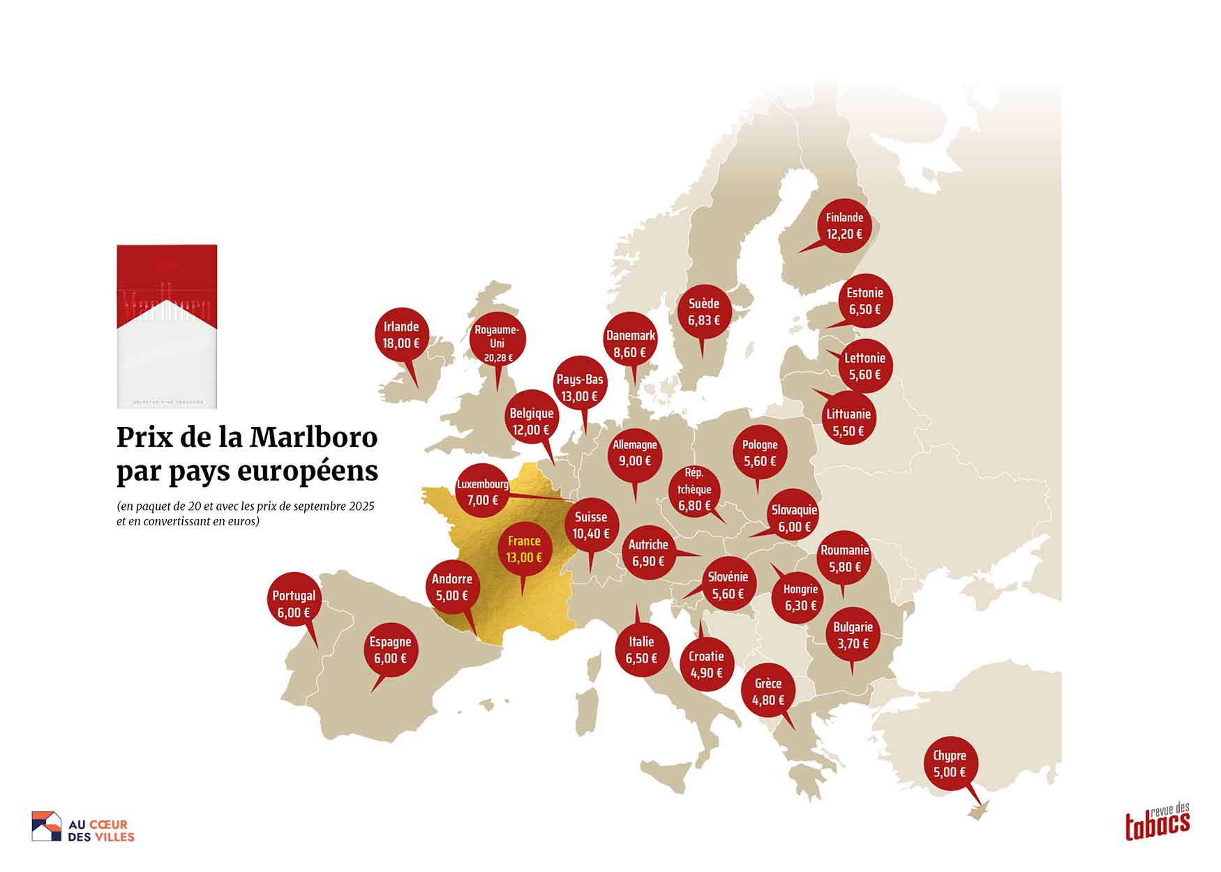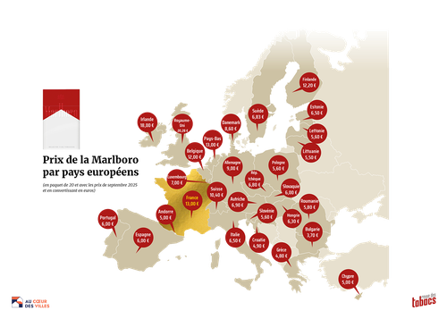 Début mars 2026. La marque Marlboro étant la cigarette la plus vendue en Europe, elle représente l’étalon idéal afin d’établir un point de situation sur les prix. Sans surprise, la France est toujours en tête du classement. En septembre 2025, et si l’on ne tient pas compte des prix des îles britanniques (20,28 €) et irlandaises (18 €) dont l’insularité complique le marché parallèle, on trouve la Marlboro en 20 la plus chère d’Europe de l’Ouest et en troisième position : la France à 13 €, avec ex aequo les Pays-Bas. Parmi les nations frontalières de la France, c’est évidemment Andorre qui est le pays le moins cher à 5 € le paquet de 20, soit presque trois fois moins élevé que dans l’Hexagone. Puis, vient l’Espagne à 6 €, l’Italie à 6,50 €, le Luxembourg à 7 €, l’Allemagne à 9 € et, enfin, la Suisse à 10,40 €. Bref, tous les pays voisins profitent de recettes fiscales financées par les fumeurs français.