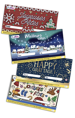 Pochettes de fin d’année : les quatre nouvelles pochettes cadeaux pour les fêtes d’une valeur de 20 euros minimum peuvent être composées par le client ou le commerçant partenaire parmi la gamme de jeux à gratter existants. Ces pochettes sont proposées depuis plus de vingt ans.