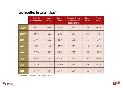 Selon le rapport de la Commission : « Le rendement des droits de consommation sur le tabac (DCT) s’est établi à 12,7 Md€ en 2024 (-0,5 Md€ par rapport à 2023) ; s’y ajoutent 0,4 Md€ de droits de licence acquittés par les buralistes. Après deux années 2020 et 2021 de rendements fiscaux de 14 Md€ en moyenne sur les seuls droits à la consommation et une année 2022 sans réforme, la loi de financement de la sécurité sociale (LFSS) pour 2023 a porté plusieurs réformes significatives visant la fiscalité du tabac dans le contexte de forte inflation (+5,3% en 2022 et +4,8% en 2023) :