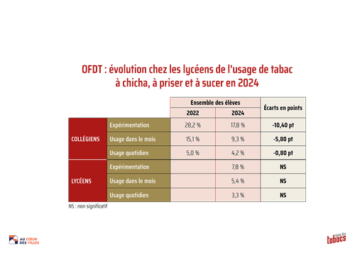 Selon le rapport de l’OFDT et concernant le tabac à narguilé : « L’usage de la chicha baisse fortement entre 2022 et 2024 : l’expérimentation perd 10 points, passant de 28,2% à 17,8%, tandis que l’usage dans l’année perd presque 6 points (15,1% vs 9,3%). Seul l’usage dans le mois, qui concerne 4,2% des lycéens en 2024, n’est pas significativement plus faible qu’en 2022 où il concernait 5% d’entre eux. L’évolution des usages de chicha observée en 2024 s’inscrit dans une baisse continue depuis les premières mesures en population adolescente en 2011. La chicha reste un usage nettement plus masculin avec des niveaux d’usage dans l’année et dans le mois environ deux fois plus élevés parmi les garçons que parmi les filles (respectivement 12,4% et 5,8% contre 6,3% et 2,7%). Sa diffusion progresse entre la troisième et la terminale, avec notamment un niveau d’expérimentation qui double (5,9% à 11,1%). »