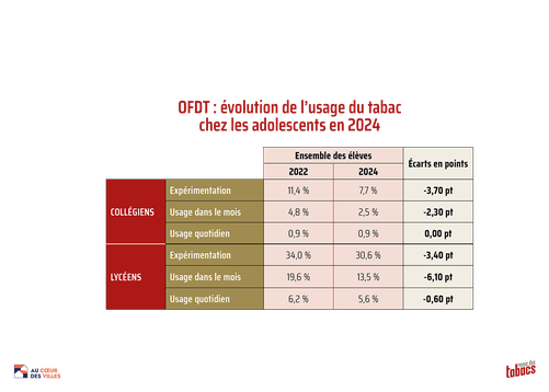 Selon le rapport de l’OFDT et concernant le tabac : « En près de quinze ans, l’expérimentation du tabac a été divisée par quatre chez les collégiens et par deux chez les lycéens, tandis que le tabagisme quotidien parmi ces derniers a été divisé par cinq. En 2024, 7,7% des collégiens et 30,6% des lycéens déclarent avoir déjà fumé une cigarette. Le tabagisme quotidien ne concerne que 0,9 % des collégiens et 5,6 % des lycéens. Ces pourcentages sont les mêmes entre garçons et filles au collège mais les lycéennes ont un peu plus expérimenté le tabac que leurs pairs. Les expérimentations ont globalement baissé depuis 2022, mais pas les usages quotidiens – qui étaient déjà alors en forte baisse. En contrepoint, la diffusion de la cigarette électronique demeure importante – supérieure à celle des cigarettes de tabac. »