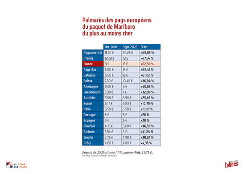 Début mars 2026. Depuis sept ans, la hausse des diverses taxes a fait grimper le prix de la Marlboro de plus de 62% dans l’Hexagone. D’octobre 2018 à septembre 2025, l’Hexagone avec ses +62,50% est au troisième rang des pays européens qui ont le plus augmenté leurs prix des cigarettes, derrière les Pays-Bas (+88,41%) et la Belgique (+81,82%), qui ont tous deux presque doublé le tarif de leurs Marlboro suite à des hausses massives de fiscalité depuis sept ans. À l’opposé, certains pays ont très peu augmenté leur fiscalité et donc leurs prix entre 2018 et 2025 : l’Italie a fait passer sa Marlboro de 5,50 € à 6,50 € (soit +1 €), l’Espagne de 5 € à 6 € (+1 €), ou la Grèce de 4,60 € à 4,80 € (+0,20€).