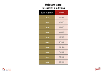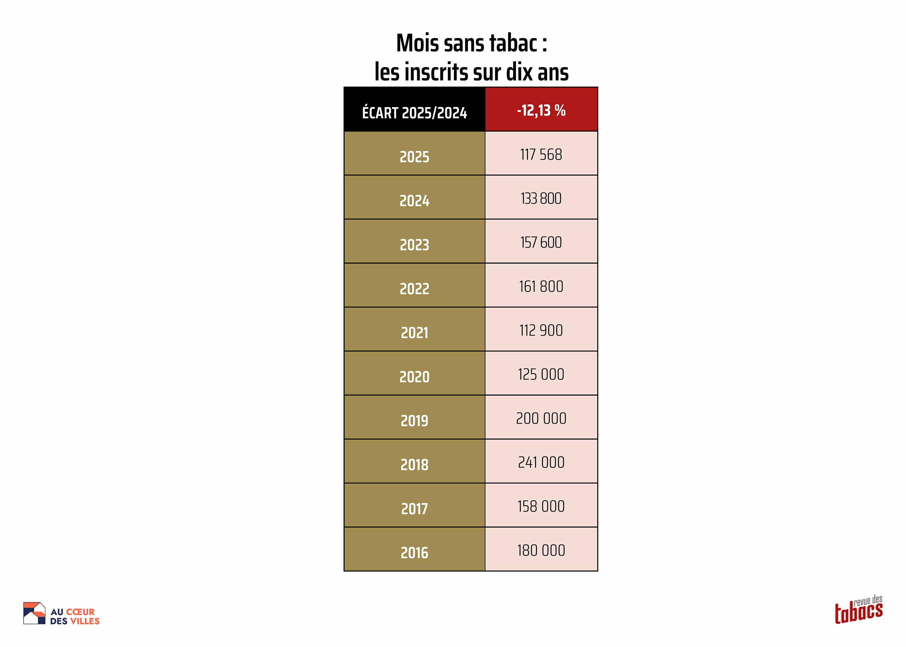 1er décembre 2025. Le dixième volet du Mois sans tabac qui a été programmé du 1er au 30 novembre 2025, a enregistré officiellement 117 568 inscrits. On constate donc une chute à - 12,13% en 2025, après les 133 838 personnes de 2024, contre 157 576 inscriptions en 2023, ou encore 161 762 en 2022 et surtout les 112 900 de 2021 (une année marquée par le Covid). Et c’est justement cette année 2021 qui a été la plus faible en inscriptions sur dix ans, puis apparaît au deuxième rang 2025.
