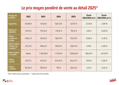 30 janvier 2026. Le Journal officiel a publié un arrêté du 26 janvier 2026 officialisant le prix moyen pondéré de vente au détail du tabac pour 2025 en France continentale. Celui-ci est calculé par segment de produits en fonction de la valeur des prix de vente au détail toutes taxes comprises, divisée par la quantité mise à la consommation. Ce prix est établi au plus tard le 31 janvier de chaque année, sur la base des données de l'année civile précédente. Ce prix moyen pondéré par segment de produits est la base de calcul de la fiscalité tabac.