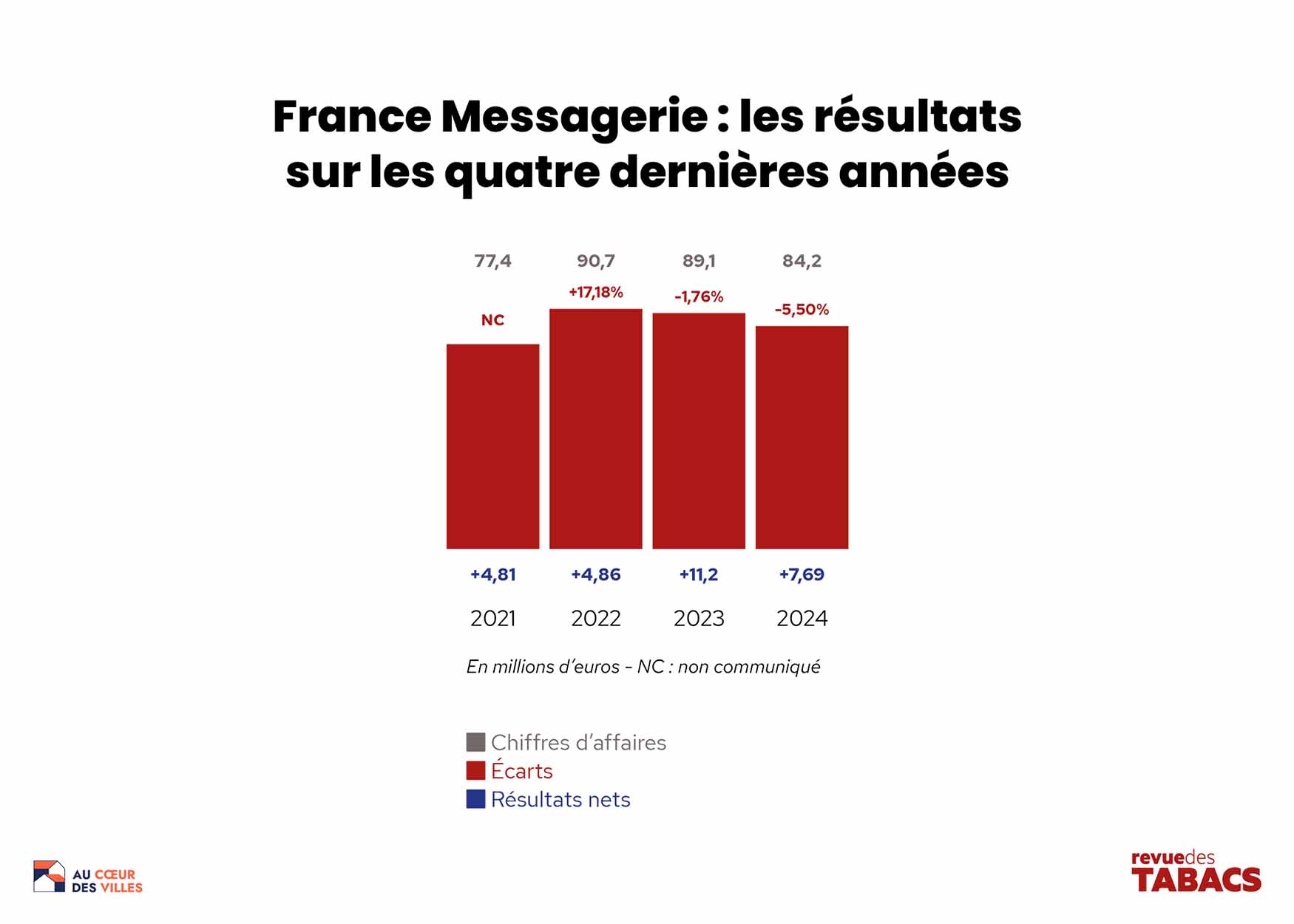 Mars 2026. La société de distribution de la presse France Messagerie a diffusé sur le site Internet d’informations économiques, Pappers, ses résultats sur les quatre dernières années, avec notamment 2024 : 84,2 M€ à -5,50% et 7,69 M€ en résultats nets à -31,34% (par rapport à 2023). Sur les quatre dernières années publiées sur Pappers, France Messagerie a enregistré un pic de chiffre d’affaires en 2022 (année électorale), puis une décrue progressive en 2023 et 2024, avec en revanche des résultats nets en très légère hausse en 2022 et qui ont fortement progressé en 2023, puis baissé en 2024.
