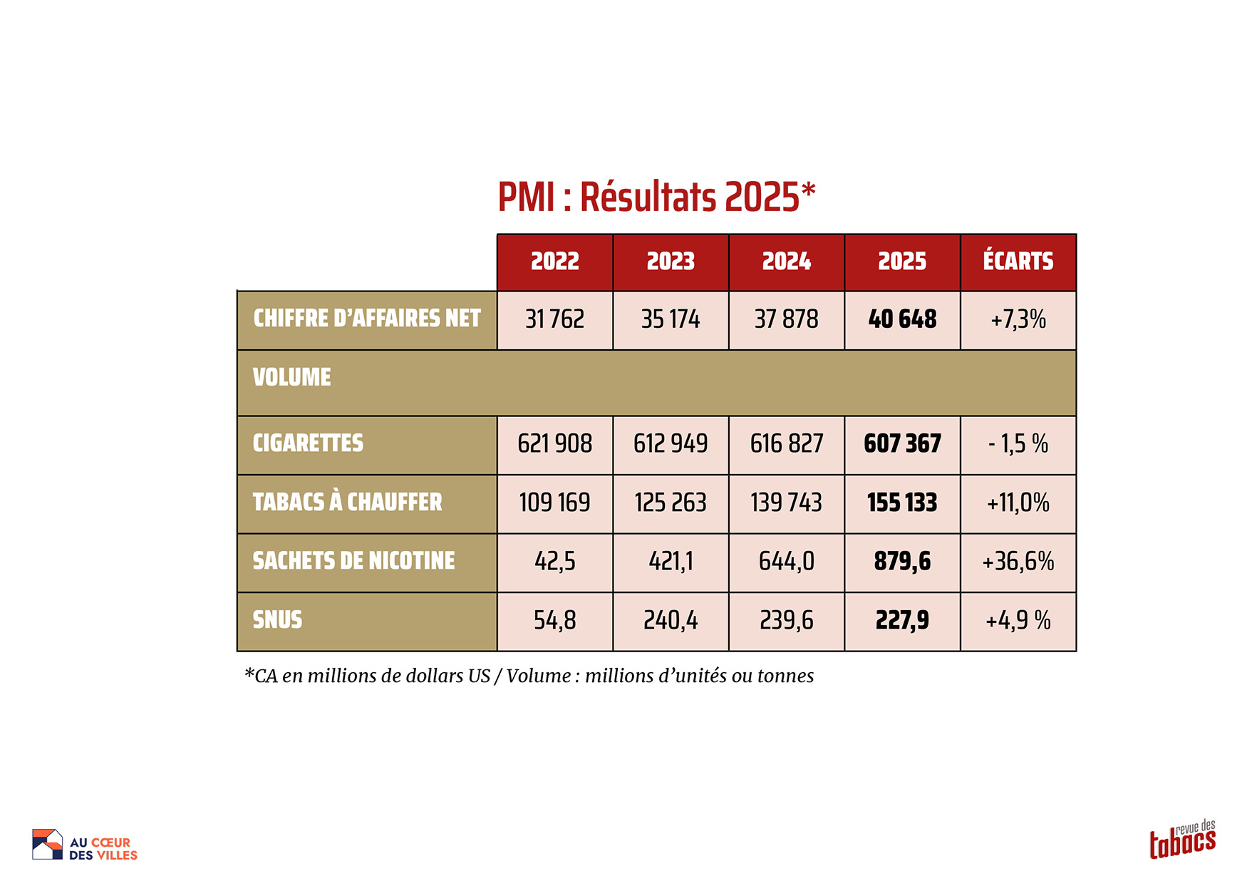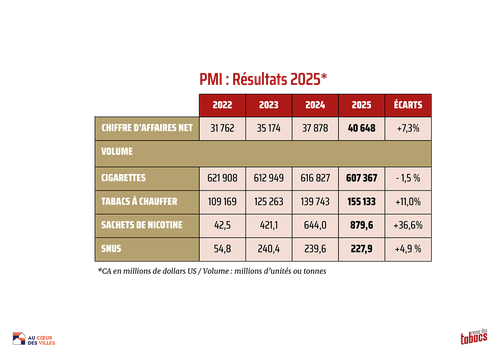 6 février 2026. Le cigarettier américano-suisse a publié ses résultats mondiaux 2025 (de janvier à décembre), avec une série de bonnes nouvelles : +7,3% en chiffre d'affaires net (tous produits confondus) ; ainsi que par ailleurs en tonnage ou millions d'unités : -1,5% en cigarettes et +11% en tabac chauffé (qui sont les deux principaux segments de PMI en volume), ou encore +36,6% en sachets de nicotine. Ainsi, en millions de cigarettes, on constate une petite baisse en 2025 et 2023, après une très légère amélioration en 2024. Sur les quatre dernières années, on observe que les tabacs à chauffer progressent nettement et c'est surtout en snus et même essentiellement en sachets de nicotine que les volumes gagnent du terrain : en passant de 42,5 millions d'unités en 2022 à 879,6 millions de « pouches » en 2025, soit +1 969,7%.