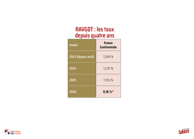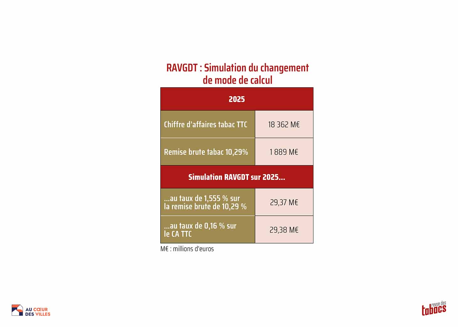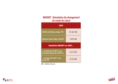5 janvier 2026. La douane, autorité de tutelle des débitants de tabac, a publié un nouveau mode de calcul de leur Régime d'allocations viagères des gérants de débits de tabac (RAVGDT). À titre d’exemple en 2025 et en France continentale, la retraite était calculée avec un taux de 1,555% appliqué sur la remise brute de 10,29% par rapport au chiffre d’affaires (CA) tabac TTC. Mais depuis le 1er janvier 2026, la RAVGDT est calculée avec un taux de 0,16 % directement sur le CA tabac TTC. Cette modification est purement comptable, elle n’impactera pas les sommes collectées, qui à titre d’exemple seraient restées à environ 29,37 M€ en 2025 quel que soit le mode de calcul.
