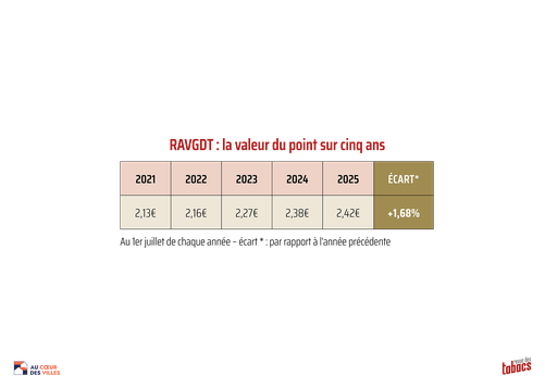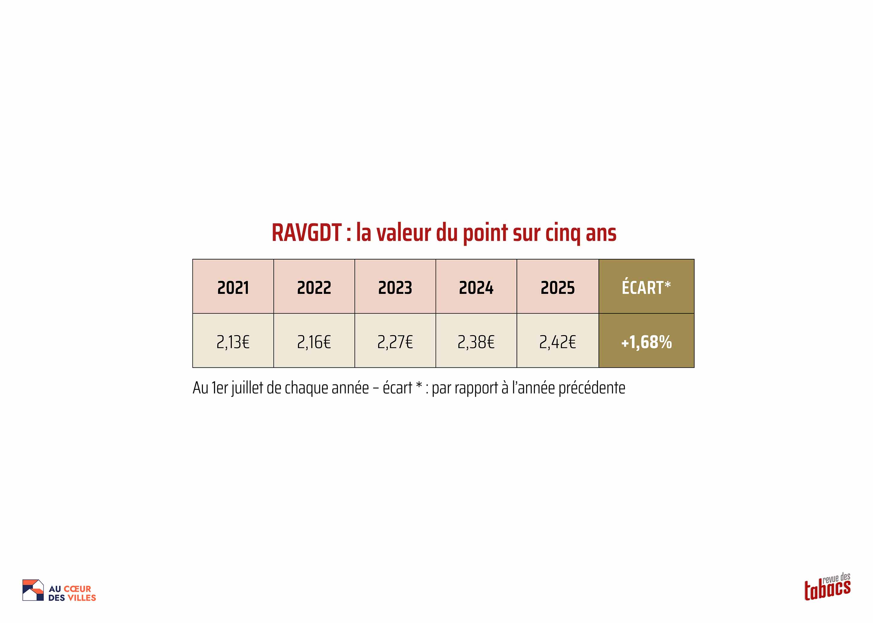 Chaque année, pour une entrée en vigueur le 1er juillet, le Journal officiel publie un arrêté du ministère des Comptes publics sur l’évolution de la valeur de service du point RAVGDT. Ce dernier est passé de 2,13 € en 2021, à 2,16 € en 2022 (soit +1,41%), ensuite à 2,27 € en 2023 (+5,09%), puis à 2,38 € en 2024 (+4,85%) et, enfin à 2,42 € en 2025 (+1,68%).