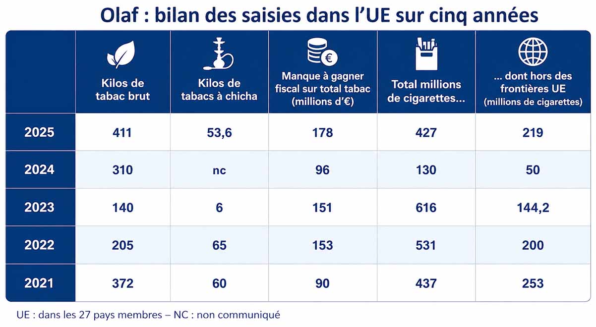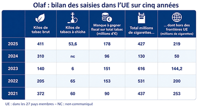 20 avril 2026. L’Office européen de lutte antifraude (Olaf), dont la mission est d’enquêter et de mettre un terme à la fraude liée aux fonds de l’Union européenne (UE), a publié son bilan 2025 des saisies concernant le tabac : 411 tonnes de tabac brut, 53,6 tonnes de tabac à chicha et 427 millions de cigarettes (dont 219 millions hors UE) ; ce volume saisi correspond à un manque à gagner fiscal de 178 millions d’euros pour l’an passé. Toutes comparaisons avec les années précédentes est inutile, puisque les résultats des prélèvements sur le marché illicite des douaniers de l’OLAF varient énormément d’une année sur l’autre.
