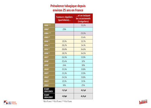 Selon le communiqué de Santé publique France : « Parmi les 18-75 ans en France hexagonale en 2024 (population comparable aux éditions précédentes du Baromètre de Santé publique France), 25% déclarent fumer (32% en 2021), 18% quotidiennement (25% en 2021). Ces baisses s'inscrivent dans une tendance initiée en 2016. Les inégalités sociales en matière de tabagisme restent très marquées : la proportion de fumeurs quotidiens est nettement plus élevée parmi les populations les plus défavorisées, elle est par exemple 2,1 fois plus élevée parmi les ouvriers que parmi les cadres (25,1% vs 11,8%). Le tabagisme quotidien est plus fréquent dans trois régions par rapport à la moyenne des autres régions : Grand Est (19,8%), Occitanie (20,6%) et PACA (20,9%). Plus de la moitié des fumeurs quotidiens (55%) déclarent avoir envie d'arrêter de fumer et 17,3% déclarent avoir fait une tentative d'arrêt d'au moins une semaine au cours des douze derniers mois. »