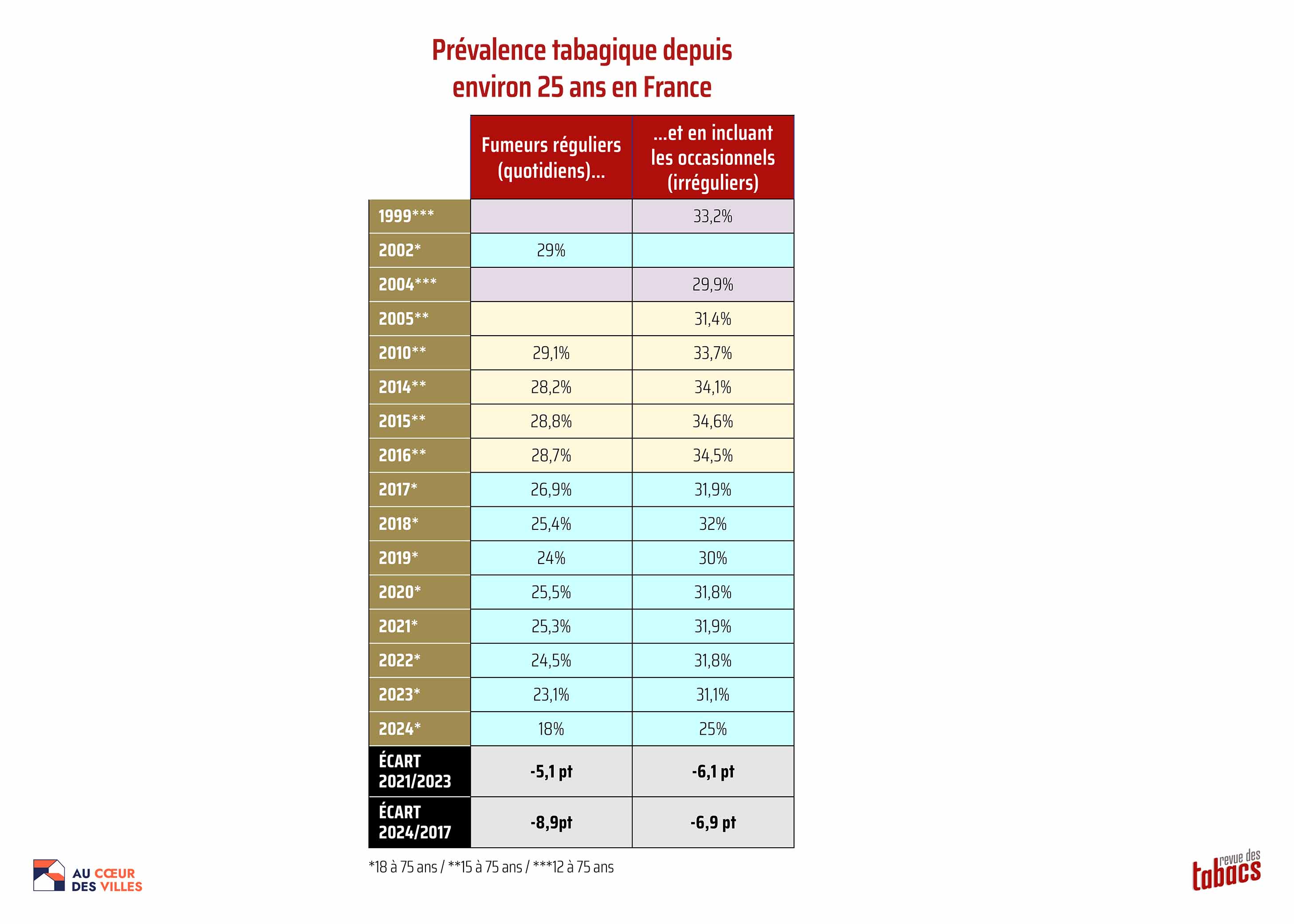 Entre 2023 et 2022, le taux de la prévalence tabagique a chuté à la fois pour les fumeurs réguliers quotidiens de -1,4 point et de -0,7 point pour l’ensemble des fumeurs (occasionnels et réguliers).