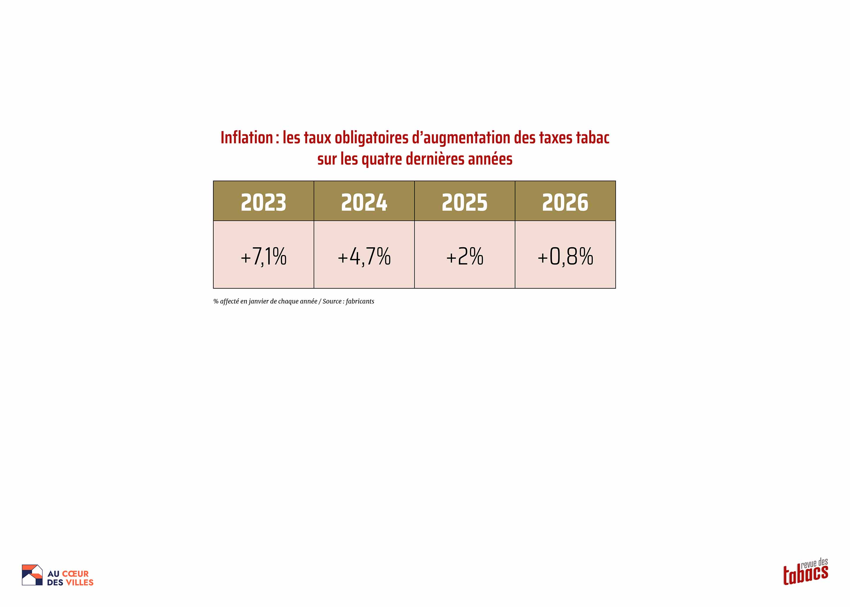 1er janvier 2026. Les fabricants de tabac ont l’obligation chaque mois de janvier d’indexer les accises tabac sur l’inflation, c’est-à-dire +0,8% applicable pour 2026. Depuis le Projet de loi de financement de la Sécurité sociale 2023 (PLFSS), les droits de consommation sur les produits du tabac en France – part spécifique et minimum de perception – sont indexés sur l’inflation, conformément à l’arrêté du 13 décembre 2022 qui a instauré une révision annuelle automatique des tarifs tabac. Ce mécanisme est censé empêcher l’érosion réelle des recettes fiscales tabac. Les accises s’appliquent sur les cigarettes, tabac à rouler-tuber, cigares-cigarillos, tabac à pipe-chicha ou tabac chauffé.
