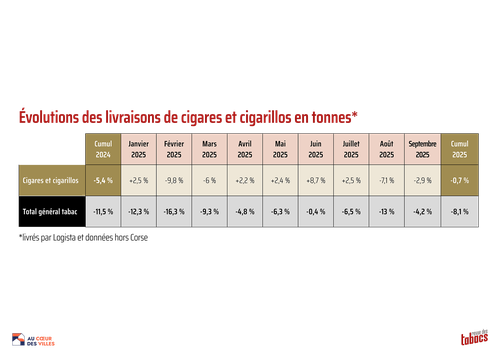 8 octobre 2025. Le principal logisticien du tabac en France, Logista, a confirmé que le volume des livraisons de cigares-cigarillos a chuté de -2,9% en septembre 2025 (avec 22 jours d’activité contre 21 sur le neuvième mois 2024), après les -7,1% en août, +2,5% en juillet, +8,7% en juin, +2,4% de mai, +2,2% d’avril, -6% de mars, -3,9% de février et +2,5% de janvier 2025. Ces volumes mensuels donnent -0,7% sur les neuf premiers mois 2025, après un cumul en 2024 à -5,4%, -6,2% de 2023, -9,3% en 2022, -4,1% en 2021 et -3,1% en 2020.