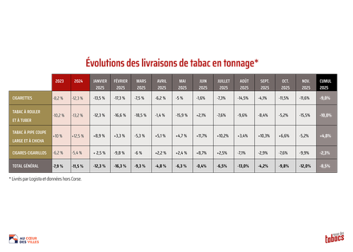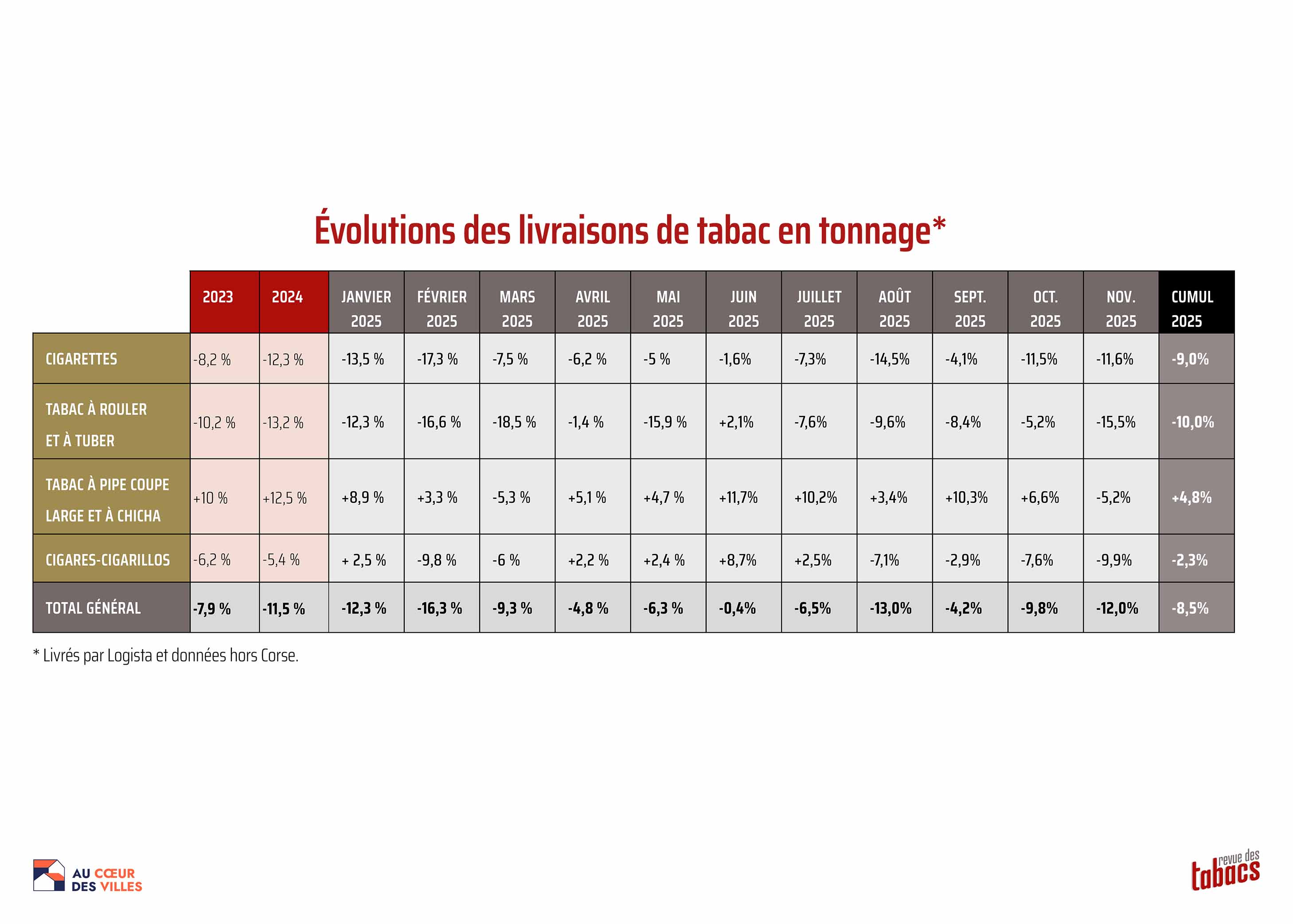 8 décembre 2025. Le principal logisticien du tabac en France, Logista, a confirmé une chute brutale du tonnage tabac (tous segments confondus) à -12% en novembre 2025, après les -9,8% en octobre, -4,2% en septembre, -13% en août, -6,5% en juillet, -0,4% en juin, -6,3% en mai, -4,8% en avril, -9,3% en mars, -16,3% en février et -12,3% en janvier 2025. Enfin, on constate un volume à -8,5% sur les onze premiers mois 2025. Avec un même nombre de jours de livraison en novembre 2025 (19) comparé au onzième mois 2024 (19), quatre des principaux segments baissent en volume sur ce mois : -11,6% en cigarettes, -15,5% en tabac à rouler et à tuber, -9,9% en cigares-cigarillos et -5,2% en tabacs coupe large, à pipe et à chicha.