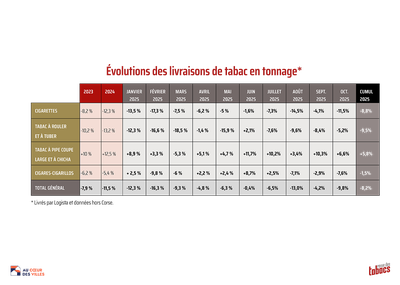 10 novembre 2025. Le principal logisticien du tabac en France, Logista, a confirmé une chute brutale du tonnage tabac (tous segments confondus) à -9,8% en octobre, après les -4,2% en septembre, -13% en août, -6,5% en juillet, -0,4% en juin, -6,3% en mai, -4,8% en avril, -9,3% en mars, -16,3% en février et -12,3% en janvier 2025. Enfin, on constate un volume à -8,2% sur les dix premiers mois 2025. Avec un même nombre de jours de livraison en octobre 2025 (23) comparé au dixième mois 2024 (23), trois des principaux segments baissent en volume sur octobre 2025 : -11,5% en cigarettes, -5,2% en tabac à rouler et à tuber et -7,6% en cigare-cigarillo. À l’opposé, on observe une nette croissance à +6,6% en tabacs coupe large, à pipe et à chicha.
