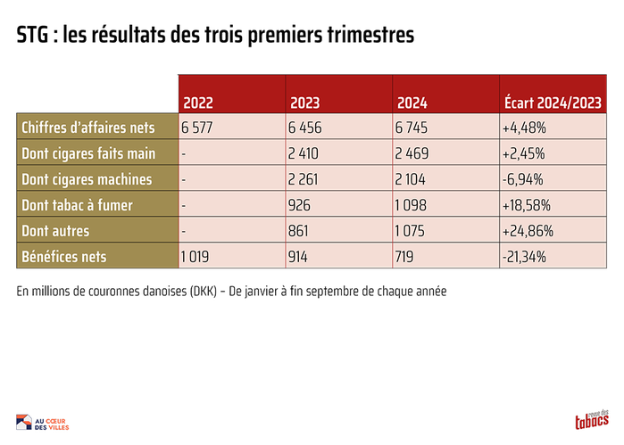 12 novembre 2024. L’entreprise danoise Scandinavian Tobacco Group (STG), qui détient une filiale leader du marché du cigare et cigarillo en France, a enregistré sur les neuf premiers mois 2024 un chiffre d’affaires net mondial en progrès de +4,48%, à hauteur de 6 745 millions de couronnes danoises (DKK), ainsi qu’un bénéfice net en baisse de -21,34% à 719 millions de DKK. À souligner : le chiffre d’affaires net de STG en cigares faits main dépasse largement celui des cigares-cigarillos faits machine.